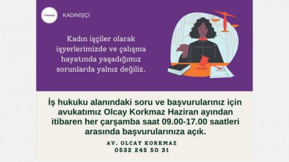 Duyuruda şunlar belirtildi: “Kadın işçiler olarak işyerlerimizde ve çalışma hayatında yaşadığımız sorunlarda yalnız değiliz. İş hukuku alanındaki soru ve başvurularınız için iş hukuku avukatımız Olcay Korkmaz her Çarşamba sizlerle. Kadın işçiler olarak yasal haklarınızı öğrenmek ve işyerlerinde yaşadığımız ayrımcılık, taciz, işçi sağlığı ve iş güvenliği sorunları gibi konularda danışmak için Kadinİşçi Hukuk Danışma hattını arayabilirsiniz. Hukuk danışma hattımız Haziran ayından itibaren her Çarşamba saat 09.00-17.00 saatleri arasında başvurularınıza açık.”