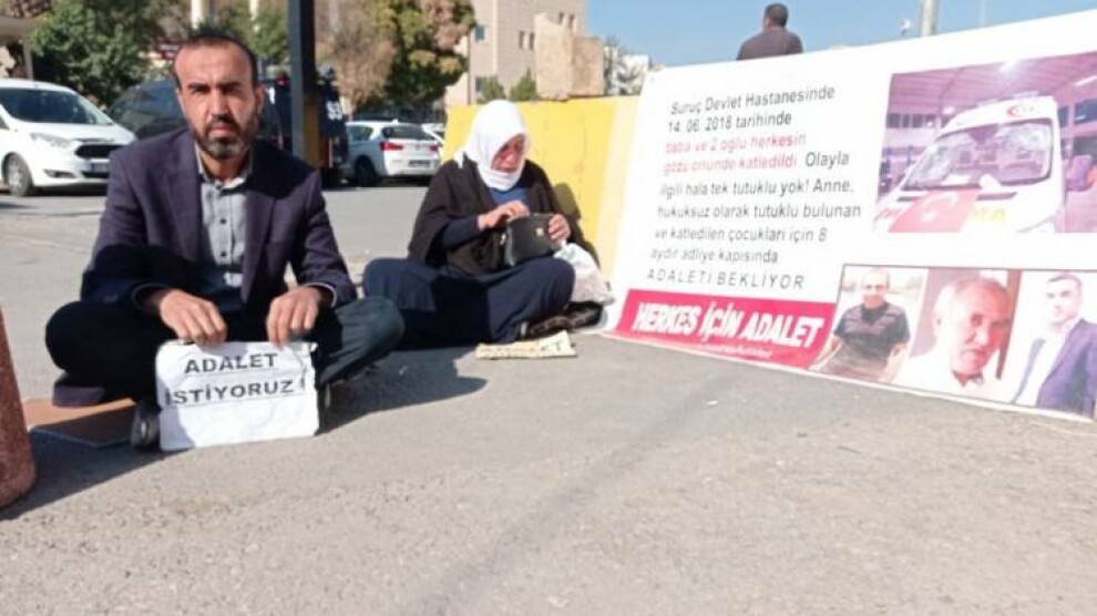 Emine Şenyaşar ile birlikte “Adalet” nöbetini sürdüren Ferit Şenyaşar, yaşananlara dair şu ifadelerde bulundu: “AKP iktidarında her gün yeni bir hukuksuzluk tarihe geçiyor. Bugün annenin duruşması var. Bugün hakim karşısına çıkacak ve ifade verecek. Suruç Devlet Hastanesi’nde gerçekleşen katliam annesinin gözleri önünde yaşandı. Annem her gün burada ağlıyor, ağıtlar yakıyor. Hastanede kimin katliam yaptığını teşhis etti. Olay üzerinden 3 yıl 5 ay geçti. Tek bir tutuklu yok. Annem ağır psikolojik tedavi ilaçları kullanıyor. Ne söylediğini hatırlamıyor. Annemin yaşadıkları karşısında söyledikleri üzerine savcılar bir suç bulduysa annem o suçu kabul edecek ve en üst seviyeden cezalandırılmayı talep edecek. Buna karşı annemin gözleri önünde katledilen 3 insan ile ilgili niye kimsenin ifadesi alınmıyor? Bu mu hukuk? Savcıların gücü anneme mi yetiyor? Katliamı yapanlar milletvekilinin kontrolünde olduğu için kimse elini taşın altına koymuyor. Savcıların iradeleri tamamen ellerinden alınmış, zulüm devam ettiriliyor.”