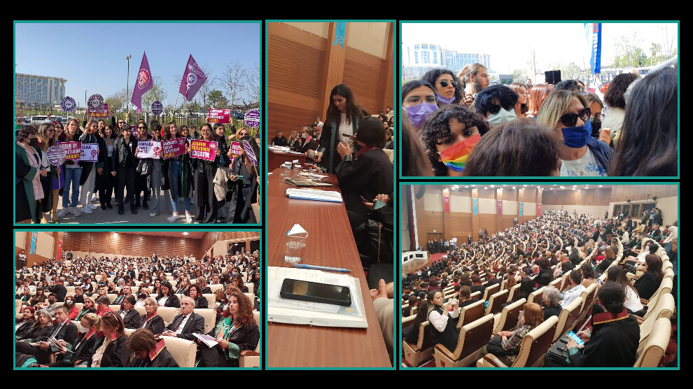 Oya Aydın Göktaş konuştuğu sırada söz alan diğer avukatlar, dışarda kalan kadınların polis müdahalesine maruz kaldıklarını söyledi ve salona alınmalarını istedi. Mahkeme başkanı, "Herkesi buraya alırsak salon çöker" yanıtını verdi. Mahkeme başkanına itiraz eden kadınlar, "Biz dışarı çıkıp arkadaşlarımızı alıp geliyoruz" yanıtını verdi ve çok sayıda avukat dışarı çıktı. Mahkeme başkanı, "50 kurum temsilcisini alabiliriz ama onun dışında alamayız sizin güvenliğiniz de tehlikeye düşer" yanıtını verdi. Bunun üzerine salonda bulunanlar alkışlarla protesto etti. Tepkiler üzerine dışarıda bekleyen tüm kadınlar içeri alındı.