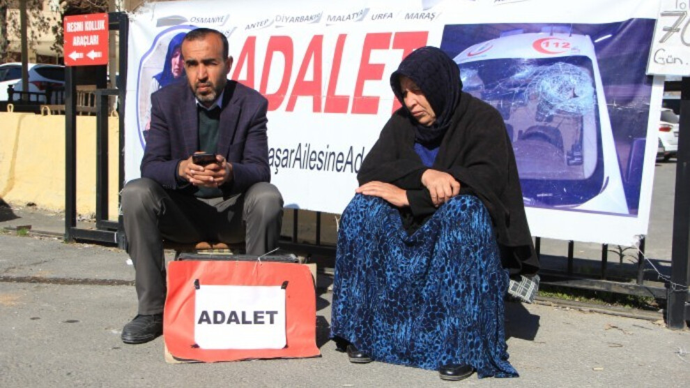 Urfa Adliyesi önüne sabah saatlerinde gelen Şenyaşar ailesi üst kısmına depremden etkilenen Kentlerin ismini yazdıkları "Adalet" yazan pankartın önünde, nöbet eylemlerini başlattı.