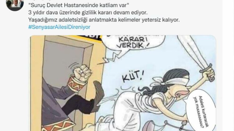 Aile sosyal medya hesaplarından, “Suruç Devlet Hastanesinde katliam var. 3 yıldır dava üzerinde gizlilik kararı devam ediyor. Yaşadığımız adaletsizliği anlatmakta kelimeler yetersiz kalıyor” paylaşımında bulundu.