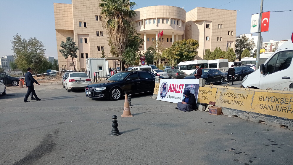 Suruç ilçesinden adliye önüne gelen Emine Şenyaşar ve Ferit Şenyaşar, "Adalet" yazılı pankart önünde eylemlerine devam ediyor. Eylemde konuşan Ferit Şenyaşar, "Pirsûs'ta bizi katledenler, farklı aileden 2 kişiyi katlettiler. Bu zülüm devam ettiği sürece yeni katliamlar da meydana gelecektir. Bu anneyi görün artık. Ortada açık bir hukuksuzluk, adaletsizlik var. Katliamı yapanlar bellidir. Katliamı kim koruyor bellidir. Artık kral çıplaktır. Bunun haykırılmasını istiyoruz" diye konuştu.