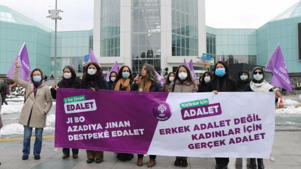 Açıklamada, "Kadınlar için erkek adalet değil gerçek adalet" yazılı pankart açılarak, "Jinjiyanazadî" ve "Susmuyoruz korkmuyoruz itaat etmiyoruz" sloganları atıldı.