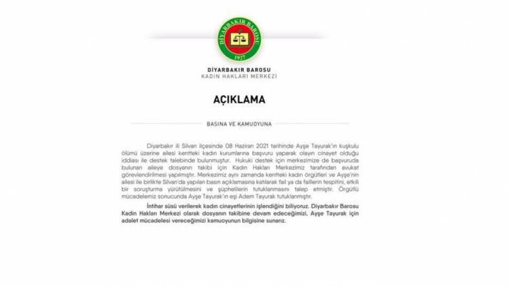 Amed- Diyarbakır Barosu Kadın Hakları Merkezi, 8 Haziran günü Amed’in Silvan ilçesinde şüpheli şekilde yaşamını yitiren Ayşe Tayurak için yazılı bir basın açıklaması yaptı. ‘ İntihar’ adı altında katledilen Ayşe Tayurak’ın fail eşi Adem Tayurak olaydan bir ay sonra geçtiğimiz günlerde çocuklarının ifadesinin esas alınması üzerine tutuklanarak cezaevine gönderildi.