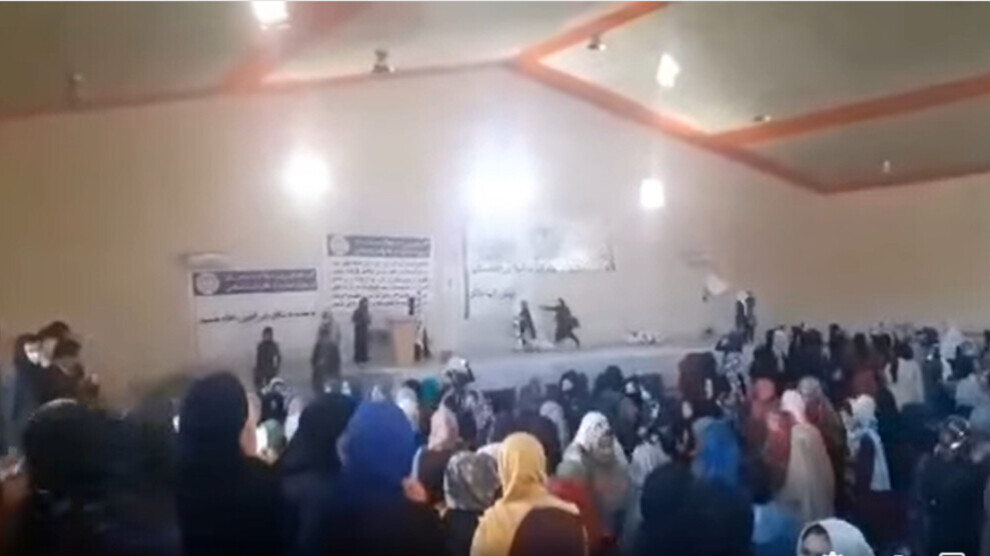 Haber Merkezi- Afganistan’ın Bamyan kentinde kadın hakları aktivistleri Taliban’ın düzenlediği toplantıyı bastı. “Bamyan halkı Taliban’ı destekliyor” sloganı ile Taliban tarafından Bamyan’da üniversite stadyumunda düzenlenen etkinlik salonunu sloganlarla basan kadınlar sahneye çıkarak pankartı aşağı indirdi.