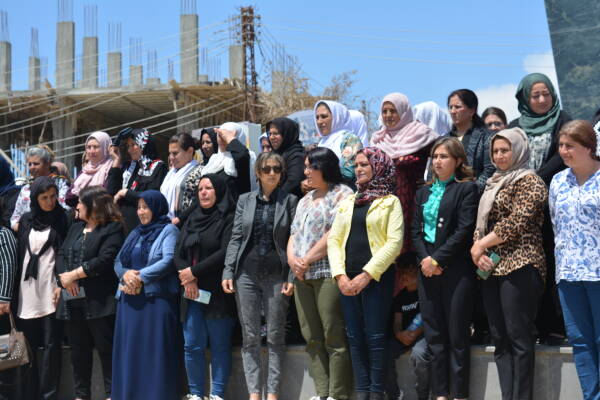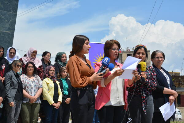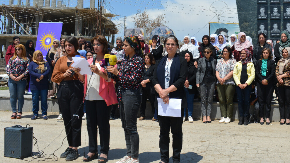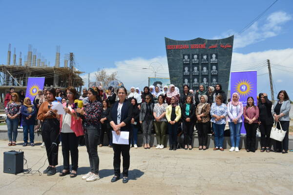Qamişlo- Son günlerde Türkiye Cumhurbaşkanı Recep Tayyip Erdoğan, bir milyon mültecinin kendi kontrolündeki Kuzey ve Doğu Suriye’ye yerleştirme konusunu gündeme getirdi. Kuzey ve Doğu Suriye Kadın Örgüt ve Hareketlerinin Ortak Eylem Platformu, yaptıkları açıklama ile Türkiye’nin bir milyon mültecinin işgal bölgelerine yerleştirmek istenmesi planlarını kınadı. Qamişlo’daki Efrin dörtyolunda yapılan açıklamaya onlarca kişi katıldı. Basın metni Qamişlo Kantonu Kangra Star yöneticisi Ibtîsam El-Huseyn tarafından okundu.