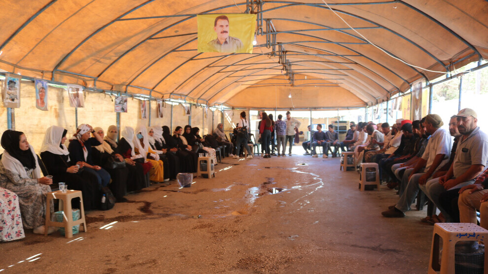 Qamişlo – Kuzey ve Doğu Suriye’nin Qamişlo kentinde 12 Ağustos tarihinde Birleşmiş Milletler (BM) Temsilciliği önünde HPC-JIN ve HPC tarafından “Adalet ve vicdanınız nerede” sloganıyla başlatılan çadır eylemi 27’nci gününde. Bugünkü eyleme Kuzey ve Doğu Suriye’nin Qamişlo kentine bağlı Til Koçer ilçesindeki yurttaşlar destek verdi.