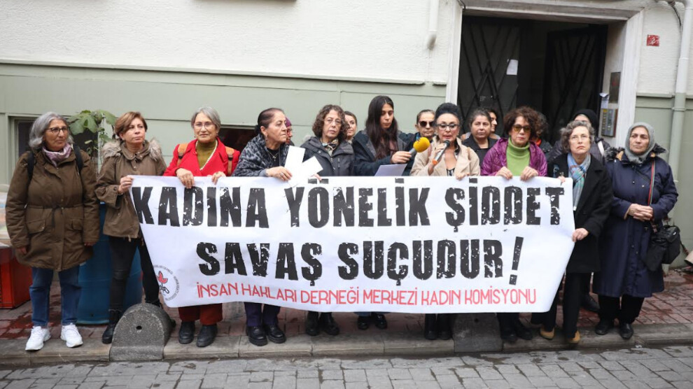 İstanbul Beyoğlu’nda bulunan İHD binası önünde yapılan açıklamaya, çok sayıda kadın katıldı. Açıklamada, “Kadına yönelik şiddet savaş suçudur” pankartı taşınırken, sık sık “Jin jiyan azadî” sloganı atıldı. Basın metnini İHD İstanbul Şube Sekteri Jiyan Kaya okudu.