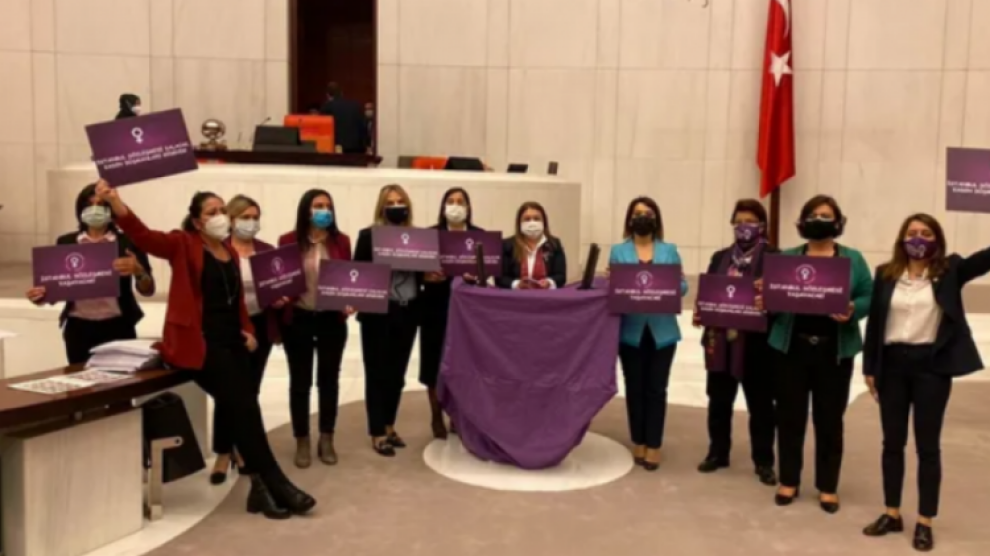 İstanbul Sözleşmesi’nin feshedilmesine tepki gösteren CHP’li kadın milletvekilleri, Meclis kürsüsüne mor örtü serdi.