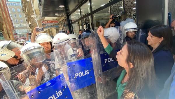 Sivil toplum örgütleri ile gerçekleşen görüşmenin ardından esnaf ziyareti yapmak isteyen heyete uzun süre izin verilmedi. Sokak polis tarafından kapatılarak siyasetçilerin geçişi engellendi. Siyasetçiler burada sık sık kalkanları iterek barikatı aşmaya çalıştı. Çevrede bulunan esnaf ve halkta yaşananlara tepki gösterdi. Ablukaya direnen DEM Partili milletvekilleri, siyasetçilere yönelik polis ablukasını tüm dünyanın gördüğünü belirtirken Tülay Hatimoğulları ve Mardin Milletvekili Kamuran Tanhan, Sıddık Akış'ın ceza aldığı soruşturmayı açanların yargılamayı sürdürenlerin FETÖ'den ceza aldığını dile getiren konuşmalar yaptı.