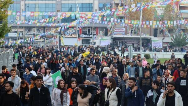 Alanda kurulan sahneye “Kürt sorununda demokratik çözüm için özgürlük yürüyüşümüzü büyütüyoruz” yazılı pankart asılırken, alana gelenler ellerinde, “Bu bir halk ikazıdır; belediyeleri boşaltın”, “Kayyıma geçit yok, kayyım talandır” ve “Çözüm de muhatap da belli” yazılı lolipoplar taşıdı.