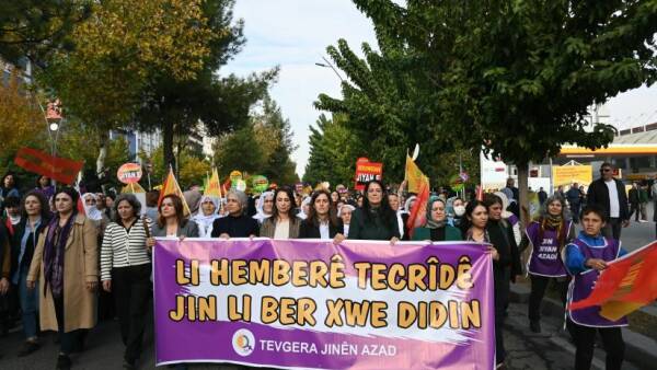 Kadınlar kortej halinde alana yürüyüş gerçekleştirdi.  Yürüyüşe, Demokratik Bölgeler Partisi (DBP) Eş Genel Başkanları Çiğdem Kılıçgün Uçar, Halkların Eşitlik ve Demokrasi Partisi (DEM Parti) Eş Genel Başkanı Tülay Hatimoğulları, belediye eşbaşkanları, TJA üyesi Ayla Akat Ata ile DEM Parti milletvekilleri de katılım sağladı. “Li hemberê tecride Jîn li berxwe didin/Tecride karşı kadınlar direniyor” pankartının arkasında yürüyen kitle, “Jin, jiyan, azadî”, “Şaredariye ya me ye/Belediye bizim”, “Direne direne kazanacağız” ve “Bijî berxwedana gelen Kurd” sloganlarıyla miting alanına vardı.