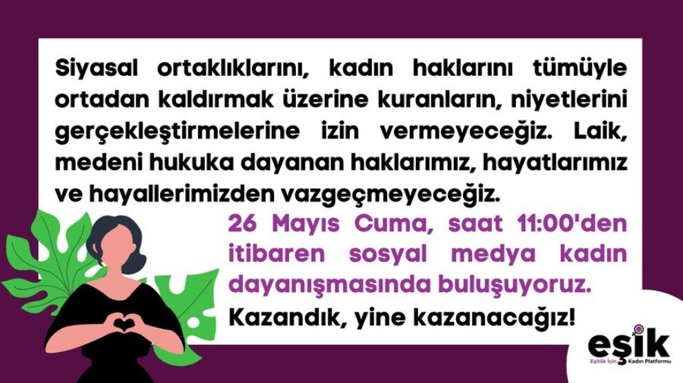 Eşitlik İçin Kadın Platformu (EŞİK), eşitlik, demokrasi, barıştan yana olan herkesi, bugün 11.00-13.00 ila 21.00-23.00 saatleri arasında yapacağı dijital medya eyleminde kadınlarla dayanışmaya çağırdı.