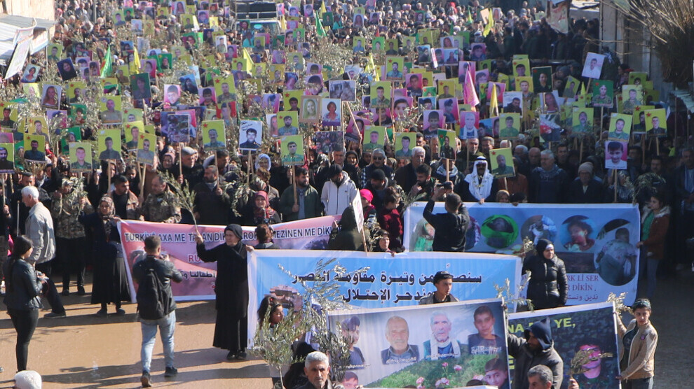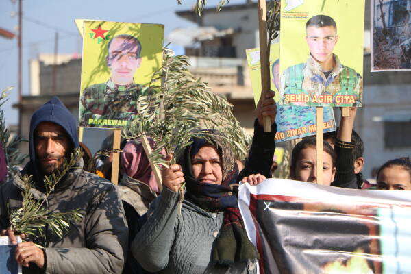 Türk devleti ve bağlı paramiliter çeteler tarafından Efrin’in işgal edilmesinin 5’nci yıldönümü vesilesiyle Şehbalılar ve Efrinliler zeytin dalları ve “Çağın Direniş” şehitlerinin resimlerini taşıyarak yürüyüş gerçekleştirdiler.