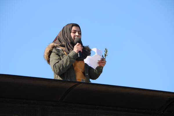 Meydanda bir araya gelen on binler adına Kongra Star Efrin-Şehba Örgütü Koordinasyon üyesi Menal Şêxo konuşma gerçekleştirdi.