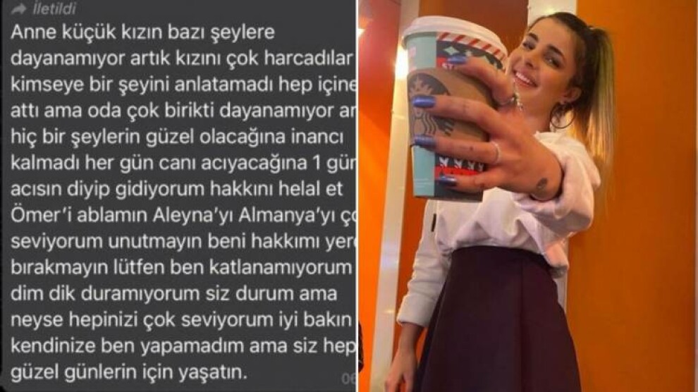 Edanur’un annesine atfen bıraktığı belirtilen mektup şöyle: “Anne küçük kızın bazı şeylere dayanamıyor artık. Kızını çok harcadılar. Kimseye bir şeyini anlatamadı, hep içine attı ama o da çok birikti dayanamıyor artık hiç. Bir şeylerin güzel olacağına inancı kalmadı. Her gün canı acıyacağına 1 gün acısın deyip gidiyorum. Hakkını helal et. Ömer’i, ablamı, Aleyna’yı, Almanya’yı çok seviyorum. Unutmayın beni, hakkımı yerde bırakmayın lütfen. Ben katlanamıyorum, dim dik duramıyorum, siz durun ama. Neyse hepinizi çok seviyorum. İyi bakın kendinize ben yapamadım ama siz hep güzel günleriniz için yaşatın”