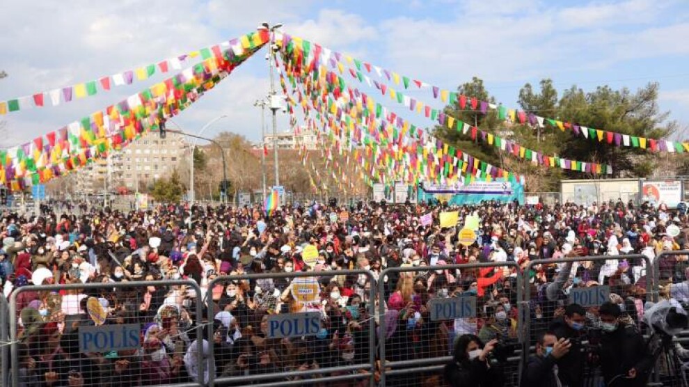 “Biz kadınlar, bin yıllardan beri bizden esirgenen özgürlüğüne öylesine susadık ki; artık bir özgürlük nehri olup akmak istiyoruz. Hem de sadece kendimiz için değil, özgürlüğe ihtiyacı olan herkes kana kana içsin diye. Kapatıldığımız evlerden, emeğimizi sömüren, fabrikalardan, aramıza çizdikleri çeşit çeşit ayrımcılık sınırlarında bıktık. Babanın, kocanın, patronun, devlet babanın çizdiği sınırlar içerisinde yaşamaya itiraz ediyoruz. Kadın cinayetlerine, taciz ve tecavüze isyan ediyoruz. Evde, iş yerinde emeğimizin sömürülmesine isyan ediyoruz. Savaş’a ayrımcılığa, ölme, öldürme siyasetine, tecride, iktidar hesapları içerisinde hayatlarımızın çalınmasına isyan edeceğiz. Her birimiz önümüze örülen setleri bir bir yıkarak, özgürlüğe yürüyoruz. Demir kapılara, beton duvarlara inat, bugün sizlere birlikte meydanlarda özgürlük halayına duruyoruz. Bizi hapsederek, kadınlara gözdağı vermek istediler. Ne biz yıldık, ne siz durdunuz. İstanbul’dan Diyarbakır’a Artvin’den Hakkari’ye barış ve özgürlük köprüleri kuruncaya kadar durmayacağız. Erkek egemen saltanatı, tarihin çöp setine atıncaya kadar durmayacağız. Bugün meydanlara çıkan, özgürlük ve barış türküleri söyleyen tüm kadınları selamlıyor 8 Mart Dünya Kadınlar Gününü kutluyorum. Yolumuz açık olsun, yolumuz kadın özgürlük yolu olsun.”