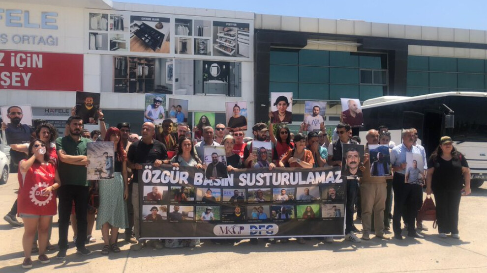 Haber Merkezi - Devrimci İşçi Sendikaları Konfederasyonu (DİSK) Basın İş üyesi gazeteciler, Diyarbakır'da tutuklanan 16 gazeteciye ilişkin 11 gündür polislerce abluka altında tutulan Ari ve Piya Prodüksiyon Şirketi önünde basın açıklaması gerçekleştirdi. Açıklamada tutuklanan 16 gazetecinin fotoğrafının üzerinde bulunduğu ve “Susturamayacaksınız” yazılı pankart açıldı.