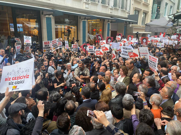 İstanbul - Yeniden görülen Gezi davasında 4,5 yıldır tutuklu bulunan iş insanı Osman Kavala’nın “darbe girişimi” suçlamasından ağırlaştırılmış müebbet hapis, diğer 16 sanıktan yedisini oluşturan Yiğit Ekmekçi, Mücella Yapıcı, Mine Özerden, Çiğdem Mater, Hakan Altınay, Can Atalay, Tayfun Kahraman’ınsa “darbe girişimine yardım” suçlamasıyla 18 yıl hapis cezası alıp tutuklanmalarının ardından Taksim Dayanışması basın açıklaması yaptı. Yüzlerce kişi hukuksuz kararı protesto etti.