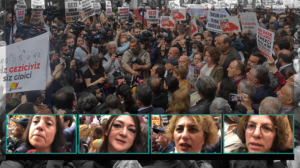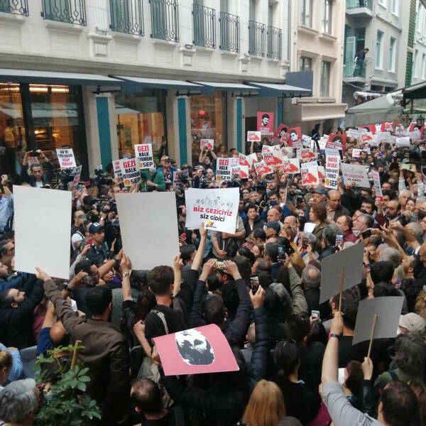 “Dünkü duruşmada avukat Can Atalay, Tayfun Kahraman ve Mücella Yapıcı’nın da içinde olduğu yedi kişi 18 yıl hapis cezası aldılar. Osman Kavala’nın ağırlaştırılmış müebbet hapis cezasıyla tutukluluğu devam ediyor. Arkadaşlarımızı tutuklayarak aldılar. Bu şunu gösteriyor: AKP iktidarı kent suçlarıyla beslenen bir iktidar. Ve bu iktidarın kent suçlarına karşı mücadele edenlere tahammülü yok. Demokratik bir ülkede yaşamıyoruz. En önceliğimiz bu ülkede demokratik bir ortam sağlanıncaya kadar hep birlikte mücadele etmek. Aksi takdirde bu hepimizin başına gelebilecek bir durum.”