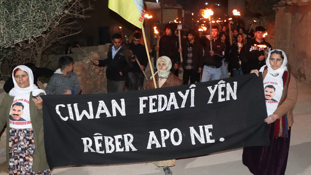 Mexmûr- 15 Şubat 1999’da uluslararası bir komployla Türkiye’ye teslim edilen Kürt Halk Önderi Abdullah Öcalan, 24 yıldır hukuksuz bir şekilde İmralı Yüksek Güvenlikli Ceza İnfaz Kurumu'nda ağır tecrit koşulları altında tutuluyor. Abdullah Öcalan’a yönelik tecrit her geçen gün derinleştirilirken, aile ve avukatlarıyla görüşmesi de engelleniyor. Mexmûr Gençlik Hareketi (TCM) ve Mexmûr Genç Kadın Hareketi (TJCM) Kürt Halk Önderi Abdullah Öcalan'a yönelik 15 Şubat Komplosunu kınamak amacıyla Mexmûr'da meşaleli bir yürüyüş düzenledi. Mexmûr halkının katıldığı yürüyüş, Şehit aileleri binasından başlayarak 4 Nisan Parkı'na kadar devam etti. Meşaleli yürüyüşte, Kürt Halk önderi Abdullah Öcalan’ın posterleri taşındı ve halk sık sık ‘Bijî Serok Apo", “Kesek Nikare Roja Me Tarî bike”, “Bimre Îxanet” ve “Jin, Jiyan, Azadî” sloganları attı. Ayrıca Kürt Halk Önderi Abdullah Öcalan için 1 Şubat’ta dönüşümlü açlık grevinde yer alanlarda yürüyüşe katıldı.