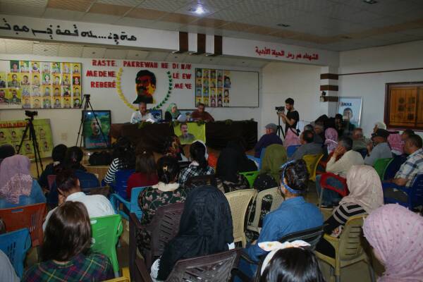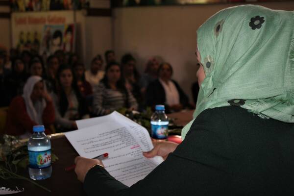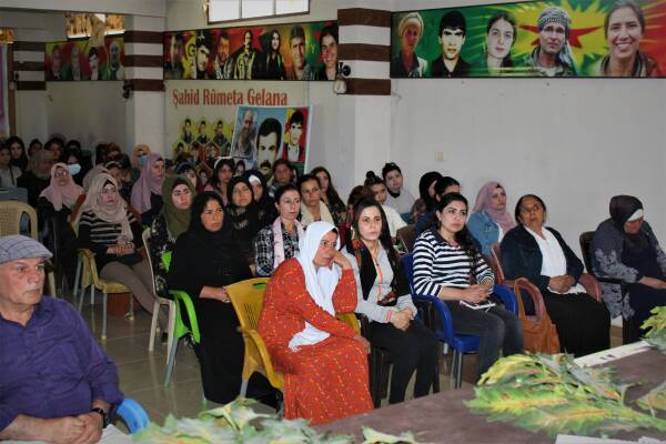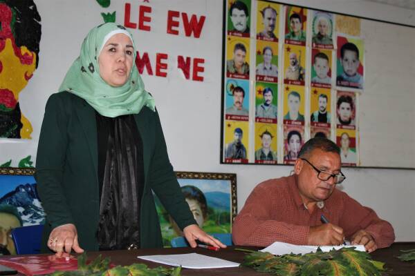 Gülnaz Osman ise Suriye halklarının toplumsal sözleşmesine doğru adım adım gittiklerini dile getirerek “Devrimden sonra ve önce diye bir zaman var artık ve bunun ortaklığını halkların toplumsal sözleşmesini birlikte oluşturuyor, tartışıyoruz. Örneğin devrimden önce buradaki dinler birbirlerine dokunmazdı ama şimdi barış içinde yaşama, yaşamını ortak kurmayı tartışıyorlar, dinlerin arasında dahi demokratik bir ortaklaşma zemini getiriyor tartışmalarımız” diye konuştu.
