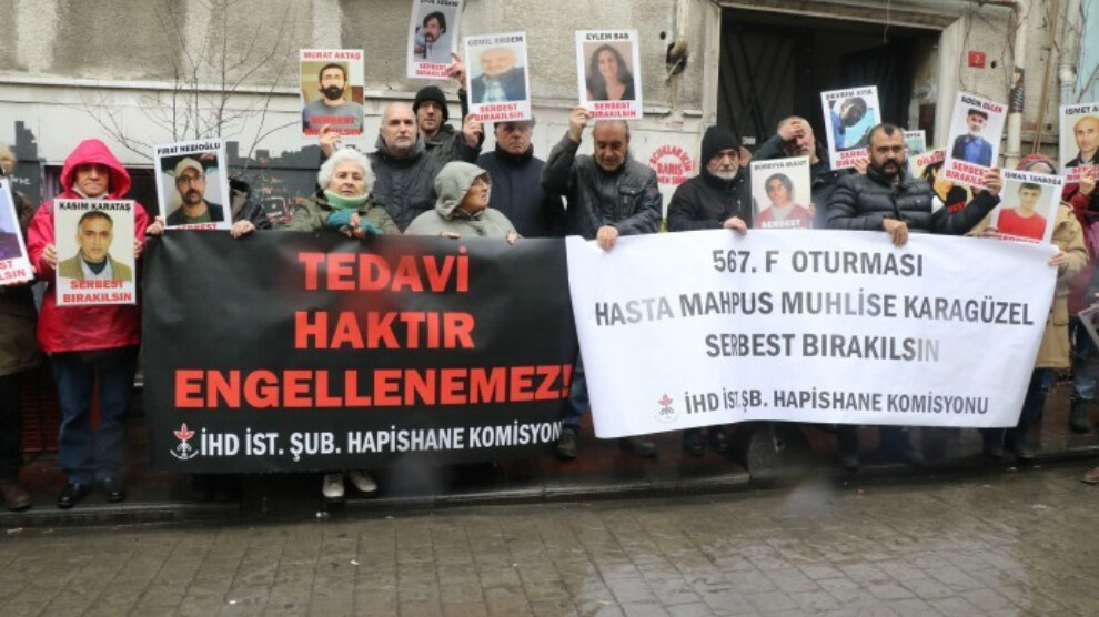 İstanbul - İnsan Hakları Derneği (İHD) İstanbul Şubesi Hapishane Komisyonu, her hafta düzenledikleri “F Oturumu” eyleminin 567’ncisini şube binası önünde gerçekleştirdi. Eylemde Kayseri Bünyan Kadın Kapalı Cezaevi’nde tutuklu bulunan ağır hasta tutuklu Muhlise Karagüzel’in (61) durumuna dikkat çekildi. “Tedavi haktır engellenemez” , “Hasta mahpus Muhlise Karagüzel serbest bırakılsın” pankartının açıldığı eylemde açıklamayı İHD İstanbul Şubesi Hapishane Komisyonu üyesi Hatice Onaran yaptı.