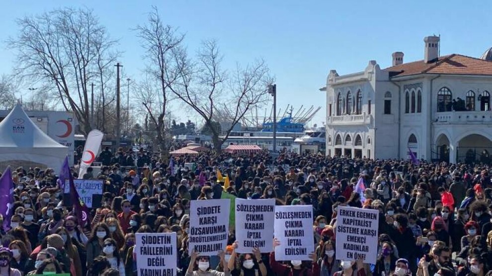 Haber Merkezi – İstanbul Sözleşmesi'ni Uygula Kampanya Grubu, sözleşmenin feshedilmesini Kadıköy'de bulunan İskele Meydanı'nda yaptığı açıklama ile protesto etti. Meydana yürüyüşle gelen kadınlar birçok yerde polisler tarafından engellenmeye çalışılırken, buna “Kadınları değil katillere engel” sloganıyla yanıt verdi. Tüm engellemelere rağmen yürüyüşlerini devam ettiren kadınların ses cihazlarına polisler tarafından el konulması ve bir grup kadının alana girişinin engellenmesi üzerine uzun süre gerginlik yaşandı. Kadınların direnişi üzerine polisler ses cihazını teslim etmek ve engellemeleri kaldırmak zorunda kaldı. Binlerce kadının buluştuğu alanda "İstanbul Sözleşmesi bizim Vazgeçmiyoruz" pankartı ve "İstanbul sözleşmesi yaşatır", "Bütün devletler erkektir, yıkılır" dövizleri taşıyan kadınlar sık sık "Aile değil kadınız, kadınlar isyandayız", "Erkek adalet değil gerçek adalet", "Kadın Cinayetleri politiktir" ve "Jin jiyan azadi" sloganlarını attı.