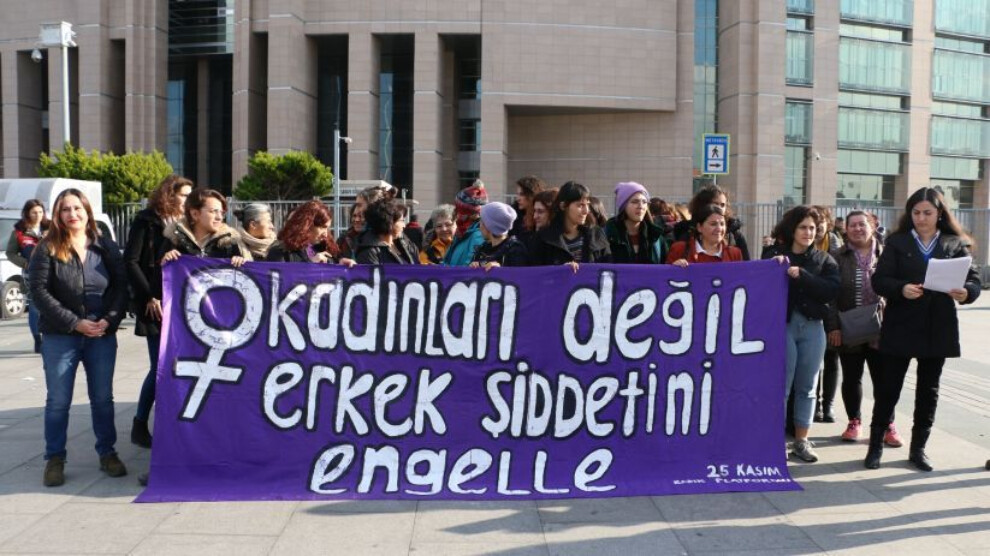 Suç duyurusu öncesinde İstanbul Adliyesi önünde basın açıklaması yapan kadınlar, “Kadınları değil erkek şiddetini engelle” pankartını açtı.