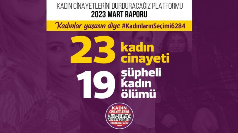 Kadın Cinayetlerini Durduracağız Platformu (KCDP), mart ayında 23 kadının erkekler tarafından katledildiğini, 19 kadının da şüpheli şekilde yaşamını yitirdiğini açıkladı.