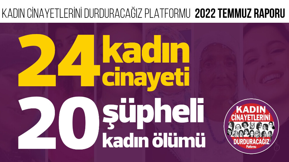 Haber Merkezi - Türkiye’de kadın katliamları artarken, iktidarın politikalarından cesaret alan failler, kadına yönelik suç işlemeye devam ediyor. Kadın Cinayetlerini Durduracağız Platformu (KCDP), Temmuz ayında katledilen kadınlara ilişkin hazırladığı raporu açıkladı. Rapora göre Temmuz ayında 24 kadın katledildi, 20 kadın da şüpheli bir şekilde yaşamını yitirdi.
