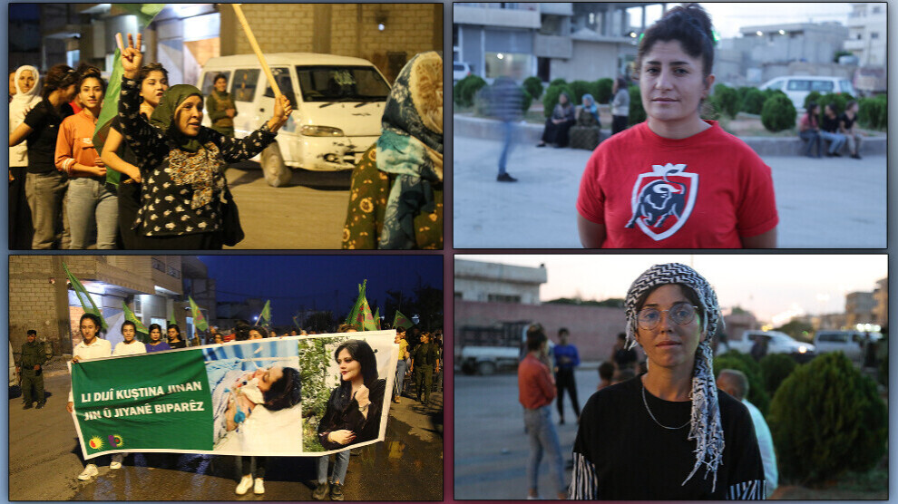 İran’da katledilen Mahsa (Jina) Amini için Kobanê’de yürüyüş gerçekleştiren genç kadınlar İran ve Rojhelatlı kadınların direnişine selam gönderdi.