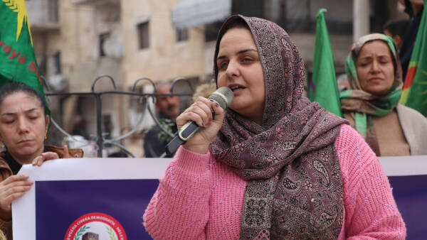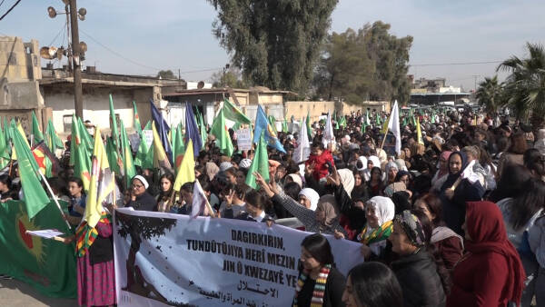 “Kadına yönelik şiddet, toplum, doğa ve evrensel değerlere yönelik bir şiddettir. Erkek-devlet zihniyeti kadına saldırarak toplumsal ve insani hakları dönüştürmeye çalışıyor. Biz, Kuzey ve Doğu Suriyeli kadınlar olarak, kadın devriminin yolunu takip ederek, kadınlar ve insanlık için şiddet, zorbalık ve katliamsız yeni bir sistem inşa edeceğiz. Tüm kadınları, Önder Apo’nun özgürlük felsefesi ışığında mücadelemizi zaferle taçlandırmak için bu mücadeleye katılmaya çağırıyoruz.”