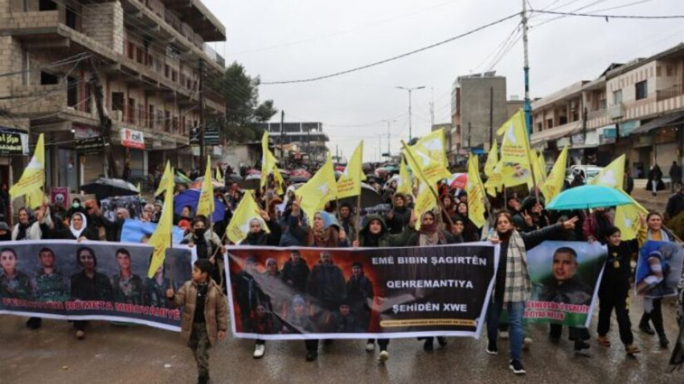 Qamişlo halkı ile Efrîn ve Şehba’dan göç etmek zorunda bırakılan yurttaşlar, Özerk Yönetim’in genel seferberlik çağrısı sonrası Qamişlo’da yürüyüş gerçekleştirdi. Sewamî Kavşağı’ndan başlayan yürüyüş, Qamişlo İç Güvenlik Güçleri’nin de katılımıyla binlerce kişinin yer aldığı kitlesel bir eyleme dönüştü ve Efrîn Kavşağı’na kadar sürdü.Yürüyüş boyunca “Şêxmeqsûd ve Eşrefiyê’nin kahramanlığıyla halkların özgürlüğünü güvence altına alacağız”, “Bijî berxwedana QSD”, “Terörist Colani” ve “Berxwedan jiyan e” sloganları atılırken, yaşamını yitiren iç güvenlik üyelerinin fotoğrafları taşındı.