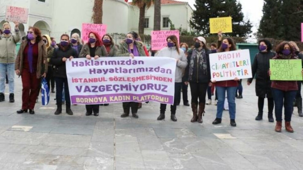 Bornova Meydanı’nda bir araya gelen Bornova Kadın Platformu ise, ‘Haklarımızdan hayatlarımızdan İstanbul Sözleşmesi'nden vazgeçmiyoruz’ yazılı pankartı taşıdı. Açıklama öncesi katledilen kadınların isimleri okunarak, "Katledilen kadınlar isyanımızdır" sloganları atıldı. Açıklamayı kadınlar adına Duygu Bölük okudu. Kadın katliamları ve şiddetin arttığını ifade eden Duygu Bölük, İstanbul Sözleşmesi’nin kimsenin iki dudağının arasında olmadığını belirtti. Duygu Bölük, "Milyonlarca kadının hayatı ve hakları tek bir adamın kararına sığamaz, milyonlarca kadının canı tek adamın bekasına kurban edilemez. Bu sözleşmeyi biz kadınlar dişimizle, tırnağımızla, mücadelemiz ile kazandık. Haklarımızı elimizden almanıza, bizleri şiddete ve öldürülmeye mahkum etmenize izin vermeyeceğiz. Sözleşmeden vazgeçmiyoruz" şeklinde belirtti.