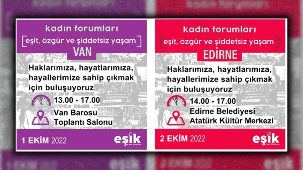 Haber Merkezi – Yazılı açıklama yapan Eşitlik İçin Kadın Platformu (EŞİK), 2023 seçimleri öncesi taleplerini duyurmak ve dayanışmak amacıyla “EŞİK Kadın Forumları” düzenleneceğini duyurdu. Açıklamada, toplamda 11 kentte yapılacak olan “Kadın Forumları”nın ilk durağının Van olacağı kaydedildi. Van Barosu’nda 1 Ekim Cumartesi günü yapılacak forumun ardından ikincisi Edirne Belediyesi Atatürk Kültür Merkezi’nde 2 Ekim Pazar günü gerçekleştirilecek. Forumlarda kadın kazanımlarına yönelik tehditler, kadın mücadelesi ve ortak talepler konuşulacak.