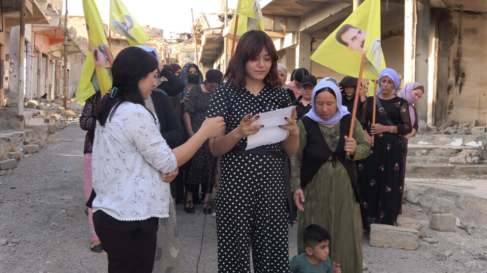 Kürt Halk Önderi Abdullah Öcalan’ın direnişinin tüm dünyaya yayıldığını söyleyen Êzidî kadınlar, “Bugün Kürdistan’ın dört parçasında ve uluslararası kamuoyunda Önder Apo’nun özgürlüğü talep ediliyor ve fiziki özgürlüğüne kavuşması için mücadele ediliyor. Biz Êzidî toplumu ve Êzidî kadınları olarak Önderliğin fikirlerinde tüm kadınların özgürlüğünü görüyoruz. Önder Apo, kadınların özgürlüğü için eşsiz bir mücadele yürüttü ve özgür bir yaşam sürme fırsatı yarattı” ifadelerinde bulundu.