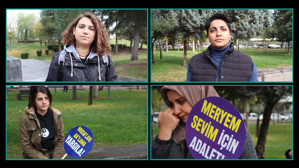 Konuya dair görüştüğümüz Meryem Sevim’in arkadaşlarından Yağmur Aslan, tehdit mesajı alan arkadaşlarından kimsenin bugün dışarı çıkamadığını belirtti. Meryem’in failinin aradan geçen zamana rağmen bulunamadığına dikkat çeken Yağmur Aslan, “Şuan onun katili hala dışarıda olduğu için savaşıyoruz. Hiçbir suçu yokken bir cani tarafından paramparça edildi. Onun katili günlerdir bulunamıyor. Bu ülkede adalet, bu ülkede hiçbir şey yokmuş demek ki. Kadın cinayeti demek çok kolay hale gelmiş. Bütün kadınlar tehdit ediliyor ve katlediliyor. Bundan önce de kadın cinayetlerine tepki gösteriyorduk ama insan acısını yaşayınca daha çok farkına varıyor” sözlerini kullandı.