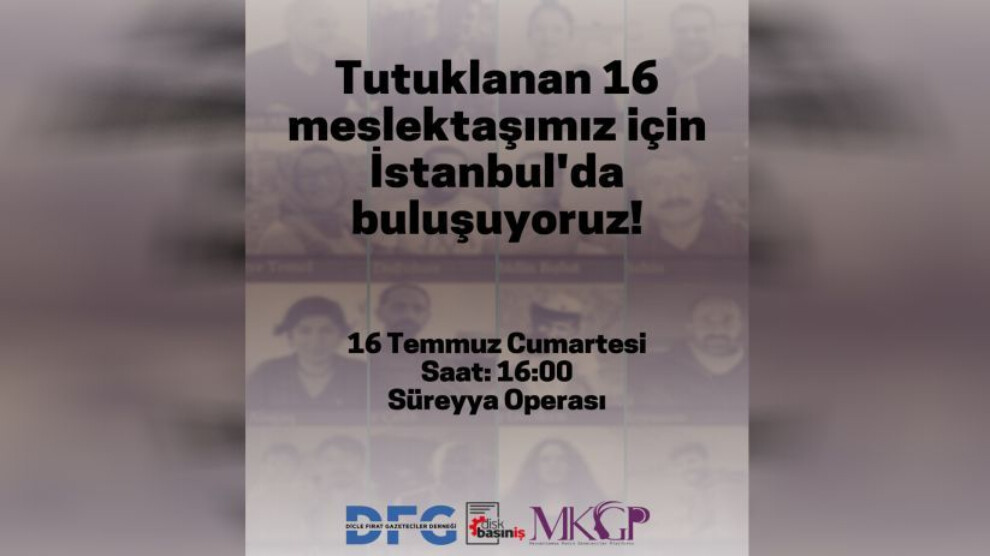 İstanbul’da ise Mezopotamya Kadın Gazeteciler Platformu (MKGP), Dicle Fırat Gazeteciler Derneği (DFG) ve DİSK Basın-İş, tutuklanan 16 gazeteci için yarın saat 16.00’da Kadıköy’de bulunan Süreyya Operası önünde toplanacak.