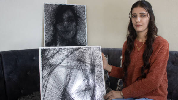 Qamişlolu 22 yaşındaki Robîn Omer’in, ahşap bir zemin üzerine çaktığı çiviler arasından geçirdiği iplerle farklı motifler ortaya çıkardığı sanatsal çalışmaları ilgi çekiyor.