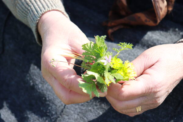 Etrafındaki çiçekleri toplayıp bir araya getiriyor ve onları göstererek sözlerine devam ediyor: